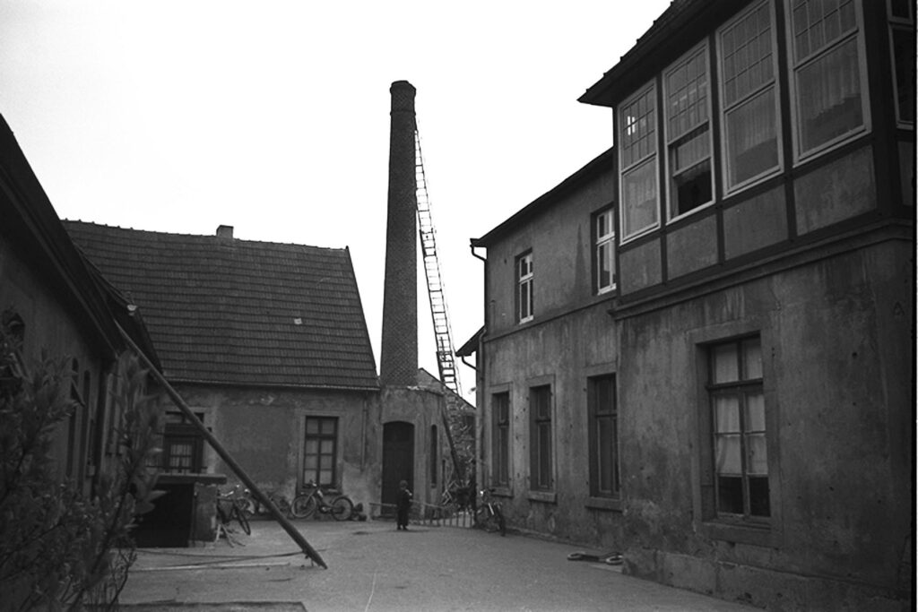 Der Schornstein der ehemaligen Brennerei wird abgebrochen. Rechts die ehemalige Poststation von 1743.