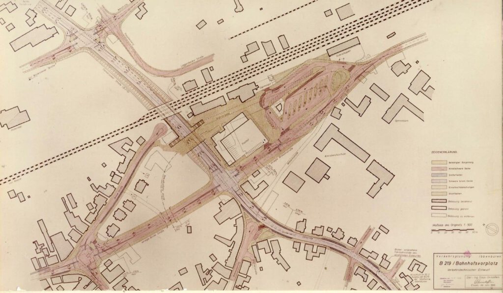 Ein weiteres wichtiges Verkehrsproblem betraf den Bahnübergang an der Osnabrücker Straße, der als zentraler Engpass galt. Im Zusammenhang mit dem geplanten Autobahnzubringer ergab sich hier die Chance, diese Situation dauerhaft zu verbessern. Hierzu ein Plan von 1966.