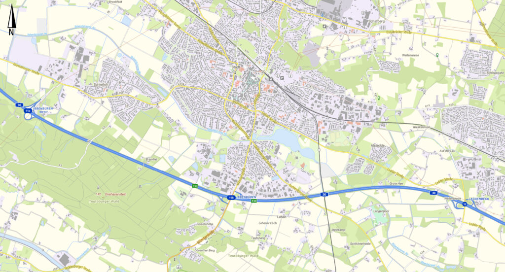 - Osttangente: Ledder Straße / Fuggerstraße mit Autobahnanschluss Laggenbeck sowie Verbindung nach Tecklenburg und Brochterbeck – ausgebaut