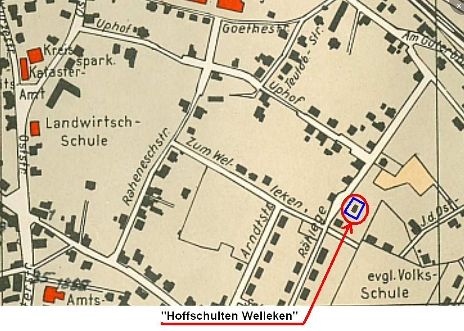 Das Lager von Hoffschulte befand sich in einem kleinen Gartenhäuschen auf einer Insel nahe der Einmündung Zum Welleken in die Rählege. Diese Insel lag in einem Teich, der durch Grundwasser und eine Quelle gespeist wurde.